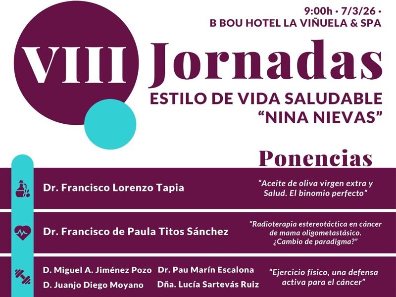 María Ramos ha explicado que las VIII Jornadas sobre Estilo de Vida Saludable ‘Nina Nieves’, estarán centradas en “la alimentación, la investigación y el ejercicio físico como pilares fundamentales en la prevención y el manejo del cáncer. “Estas jornadas buscan concienciar a la población, fomentar hábitos saludables y ofrecer un espacio de encuentro y apoyo para pacientes y familias”, ha expresado la presidenta de la Asociación Esperanza que será la encarga de abrir la jornada junto a Marita Nebrera, trabajadora social sanitaria, responsable de Atención Ciudadana del AGES Este de Málaga - Axarquía