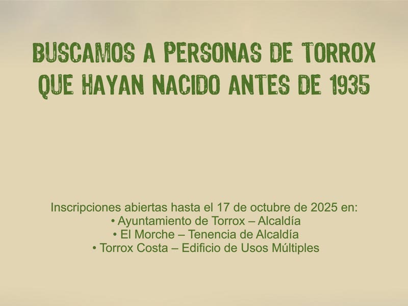 El Ayuntamiento de Torrox busca a sus mayores de 90 o más años, esto es, que hayan nacido antes de 1935, para rendirles homenaje. El alcalde, Óscar Medina, y la concejala del área y diputada provincial Sandra Extremera, han avanzado que estos vecinos del municipio serán protagonistas en el mes noviembre de la próxima Gala del Mayor 2025 como reconocimiento “a quienes representan la memoria viva de nuestro pueblo”. Las inscripciones de las personas o familias interesadas en participar estarán abiertas hasta el próximo día 17 de octubre. Medina ha expresado que “es lo menos que podemos ofrecer a toda una generación que nos ha ofrecido un legado lleno valores de trabajo, sacrificio y amor por nuestro pueblo”.