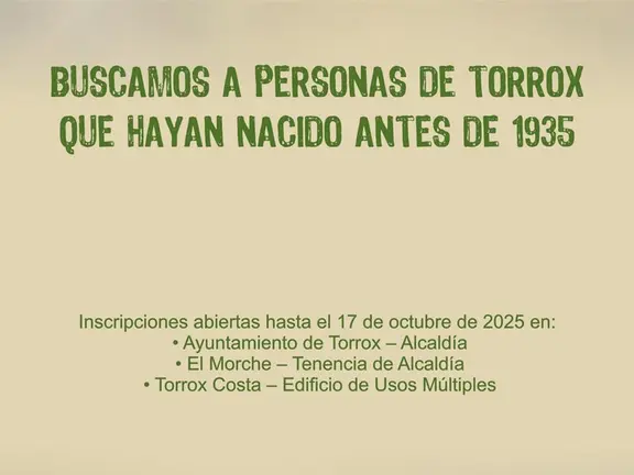 El Ayuntamiento de Torrox busca a sus mayores de 90 o más años, esto es, que hayan nacido antes de 1935, para rendirles homenaje. El alcalde, Óscar Medina, y la concejala del área y diputada provincial Sandra Extremera, han avanzado que estos vecinos del municipio serán protagonistas en el mes noviembre de la próxima Gala del Mayor 2025 como reconocimiento “a quienes representan la memoria viva de nuestro pueblo”. Las inscripciones de las personas o familias interesadas en participar estarán abiertas hasta el próximo día 17 de octubre. Medina ha expresado que “es lo menos que podemos ofrecer a toda una generación que nos ha ofrecido un legado lleno valores de trabajo, sacrificio y amor por nuestro pueblo”.