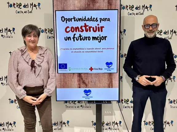 El concejal de Asuntos Sociales, Juan García, junto a la presidenta comarcal de Cruz Roja, Ana Isabel Rincón, han presentado este acuerdo en la Tenencia de Alcaldía de Torre del Mar, destacando la importancia de seguir trabajando de forma conjunta en la mejora de las oportunidades laborales de la ciudadanía.