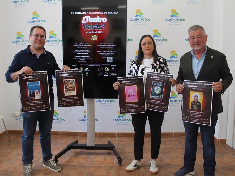 El presidente de la Mancomunidad de Municipios de la Costa del Sol, Jorge Martín; el teniente alcalde de Almáchar, Mario Torres; la concejala de Cultura y representante de la Asociación Teatral El Lugá, Rocío Reyes, han presentado esta mañana la XV edición del Certamen de Teatro Nacional ¿Teatro Verás? que arrancará este viernes 7 de noviembre a las 21:30 horas.