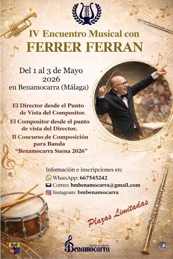 Además, ha anunciado la segunda edición del Concurso de Composición para Banda “Benamocarra Suena 2026”, en el que se estrenará una obra inédita dirigida por su propio autor. Durante el concierto de clausura se entregarán las menciones y el premio principal, acompañado de un trofeo. El Ayuntamiento obsequiará a todos los participantes con un libreto que incluye las partituras de los pasodobles Benamocarra Suena y Benamocarra y olé.