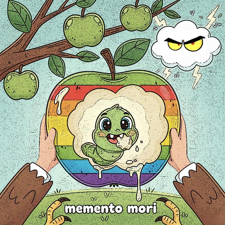 Su existencia transcurre entre roer y roer. A medida que avanza, la pulpa del túnel que queda a su espalda se va cerrando, quedando compacta. Flavio no lo sabe, por eso cree que el lugar donde vive es inagotable, un universo infinito. Tampoco sabe que su mundo cuelga de un árbol. No importa, tampoco sabe qué es un árbol. Como tampoco sabe que un día la manzana caerá al suelo y se pudrirá con él en su interior. Mejor así, no le amarguemos el momento. Dejemos que sueñe que su pulpa es infinita. La naturaleza así lo ha dispuesto. ¿Quiénes somos nosotros para perturbar su felicidad?