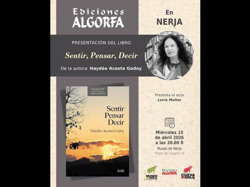 Haydée Acosta presenta el libro Sentir, pensar, decir, (Ed. Algorfa) en el Museo de Nerja, el próximo El próximo 15 de abril, a las 20:00 horas.