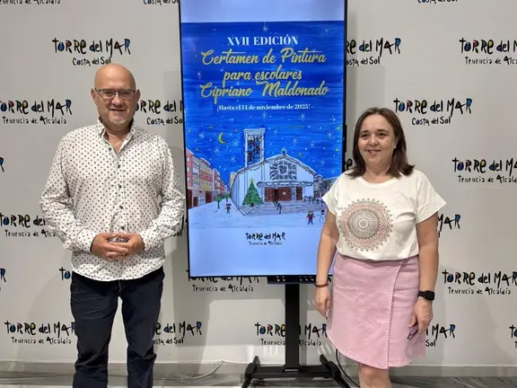 El primer teniente de alcalde del Ayuntamiento de Vélez-Málaga y teniente de alcalde de Torre del Mar, Jesús Pérez Atencia; junto a Mari Carmen Maldonado, han presentado la XVII edición del Certamen de Pintura Escolar ‘Cipriano Maldonado’, que como cada año propone un dibujo navideño a los niños de Torre del Mar para buscar su postal de felicitación navideña y premiar la creatividad de los más jóvenes de nuestro pueblo.