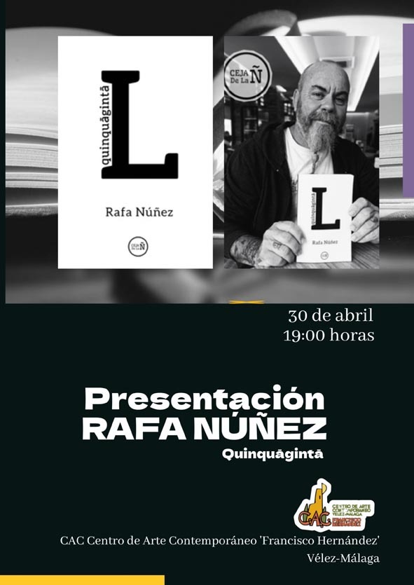 El poeta Rafa Núñez presentará su nuevo poemario, Quinquāgintā, el próximo 30 de abril a las 19:00 horas en el Centro de Arte Contemporáneo Francisco Hernández de Vélez-Málaga.