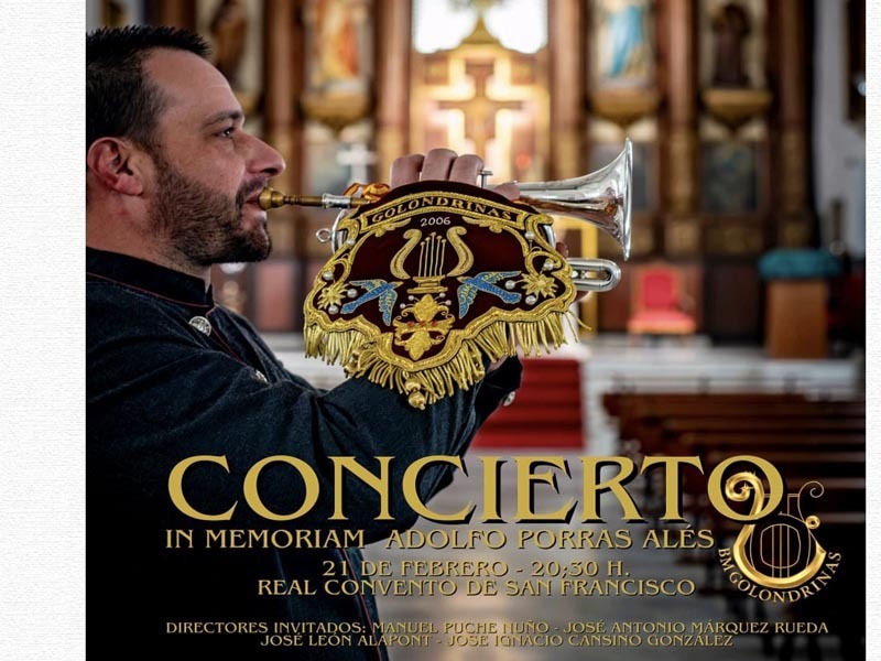 La banda de música Las Golondrinas celebrará su XX aniversario el próximo 21 de febrero en el Real Convento de San Francisco a las 20:30 horas. El evento rendirá homenaje al fallecido Adolfo Porras, fundador y vicepresidente de la agrupación, con el concierto 'In Memoriam Adolfo Porras Alés', que estará dirigido por cinco batutas: José Ignacio Cansino, José León Alapont, José Antonio Márquez, Carlos Manuel Puche y el director titular de la formación, Aitor Travé Capilla. La presentación correrá a cargo de Enrique Atencia.