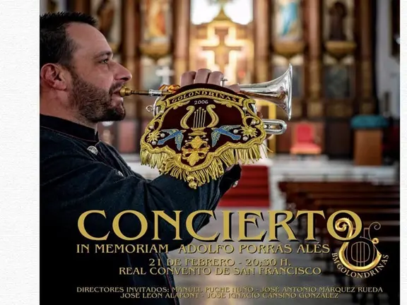 La banda de música Las Golondrinas celebrará su XX aniversario el próximo 21 de febrero en el Real Convento de San Francisco a las 20:30 horas. El evento rendirá homenaje al fallecido Adolfo Porras, fundador y vicepresidente de la agrupación, con el concierto 'In Memoriam Adolfo Porras Alés', que estará dirigido por cinco batutas: José Ignacio Cansino, José León Alapont, José Antonio Márquez, Carlos Manuel Puche y el director titular de la formación, Aitor Travé Capilla. La presentación correrá a cargo de Enrique Atencia.