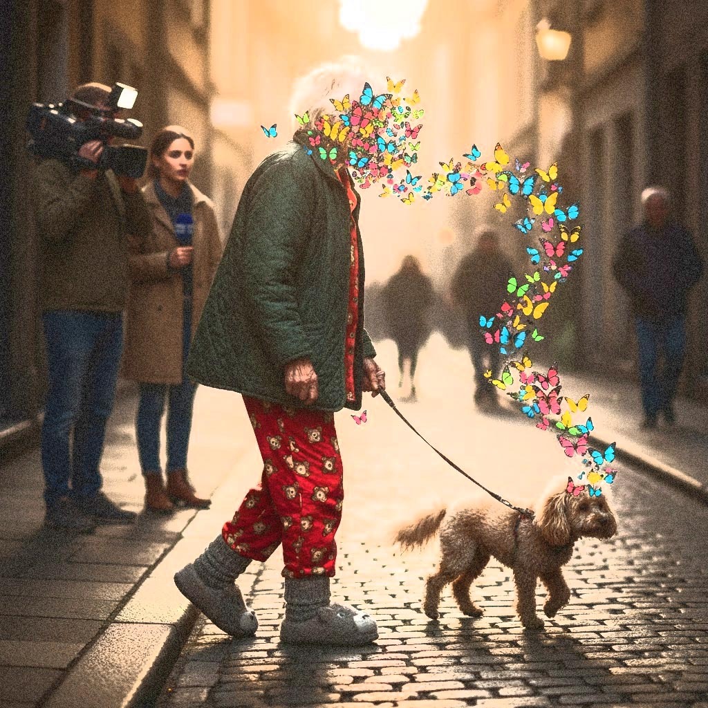 Al lado de la farola y como salido de la nada, un cámara me enfocaba inmortalizando  un primerísimo primer plano de mi estupor. Era la televisión. ¡La entrevista era para la televisión…! Trágame, tierra, pensé. Trágame con todos mis osos y mis gatos. No me podía imaginar que eso me estuviera pasando a mí. Tan temprano, tan de repente, en una calle olvidada dos madrugadores reporteros de la televisión local me pillaban in fraganti con mi exclusivo modelo fashion.