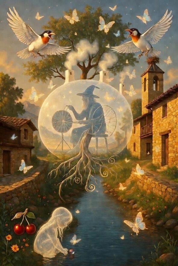 Sigue allí. Aquella niña con pendientes de cerezas, sigue allí. Se quedó sentada soñando primaveras, en aquella piedra redonda donde hilaba la bruja.