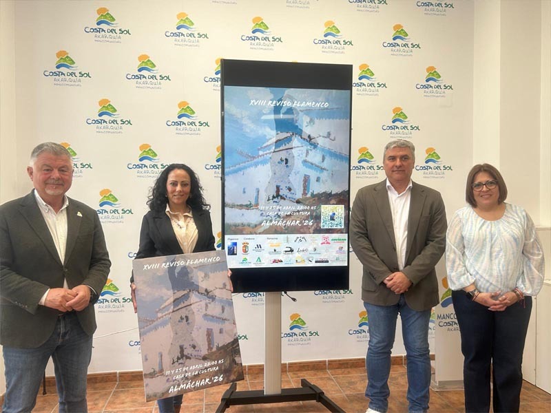 El presidente de la Mancomunidad de Municipios de la Costa del Sol Axarquía, Jorge Martín; el alcalde de Almáchar, Antonio Yuste, alcalde de Almáchar y la presidenta de la Asociación Amigos del Flamenco, María José Martín y la vocal de la Junta Directiva, Aroa Palma, han presentado esta mañana el cartel de la XVIII edición del Reviso Flamenco que comenzará este sábado 11 de abril.