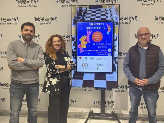 El primer teniente de alcalde del municipio de Vélez-Málaga, Jesús Pérez Atencia, junto a los profesores del IES Almenara Sergio Florido y Noelia López, ha presentado en rueda de prensa el II Encuentro de Ajedrez Intercentros, una iniciativa educativa que volverá a reunir a alumnado de distintos centros de la zona en torno al ajedrez como herramienta de convivencia, compañerismo e intercambio de experiencias.