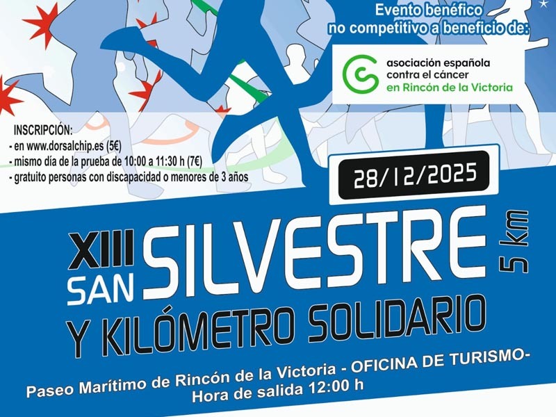 Rincón de la Victoria celebrará el próximo domingo 28 de diciembre la XIII Carrera San Silvestre y el Kilómetro Solidario, un evento deportivo, lúdico y solidario cuyos fondos se destinarán este año a la Asociación Española contra el Cáncer (AECC) de Rincón de la Victoria.