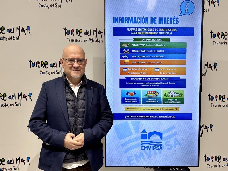 El primer teniente de alcalde del Ayuntamiento de Vélez-Málaga y teniente de alcalde de Torre del Mar, Jesús Pérez Atencia, ha comparecido en rueda de prensa para informar de un «nuevo paso» impulsado desde la empresa municipal Emvipsa con el objetivo de reforzar el mantenimiento y mejora de los servicios e instalaciones municipales del municipio.