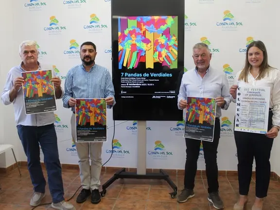El presidente de la Mancomunidad de Municipios de la Costa del Sol Axarquía, Jorge Martín; el alcalde de Colmenar, José Martín; la concejala de Cultura, María José Juárez y el representante de la Escuela de Verdiales de Colmenar, Manuel Robles, han presentado esta mañana la XXI edición del Festival Itinerante de Verdiales que se celebrará en Colmenar el sábado 8 de noviembre a partir de las 18:00 horas.