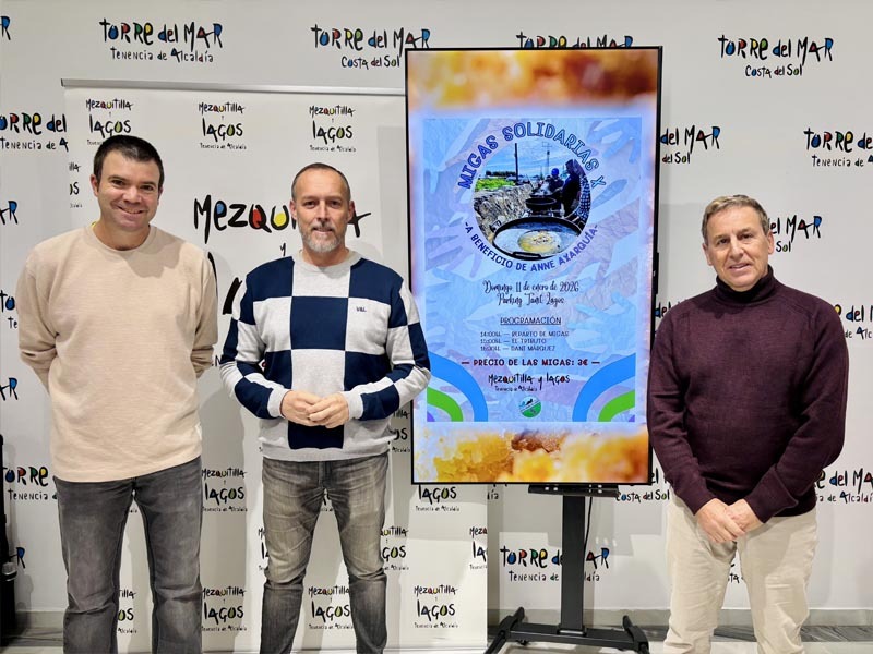 El teniente de alcalde de Mezquitilla y Lagos, David Vilches, ha presentado junto a Francisco Escamilla Muñoz, presidente de ANNE Axarquía, y Carlos Palacios, presidente de la Asociación Bahía de Lagos, una nueva edición de las Migas Solidarias de Lagos, una cita ya consolidada en el calendario festivo y solidario del municipio.