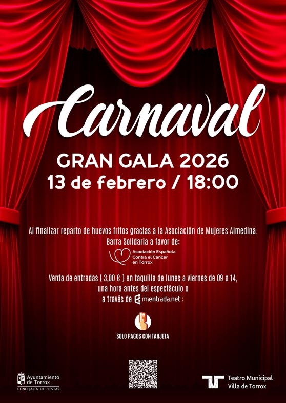 “Es una gala para disfrutar, compartir y ayudar en la que el carnaval, la cultura y la solidaridad se dan de la mano en el Teatro Villa de Torrox”, ha manifestado, por su parte, el concejal Fiestas y Tradiciones Populares, Salvador Escudero. En una tarde “llena de tradición y humor”, la gala será presentada por la administrativa y vecina de Los Llanos Georgina Toro, y el pregón será pronunciado por la empresaria y decoradora de eventos Rocío Romero. También se entregará la Máscara de Oro del Carnaval 2026 al grupo de vecinos y amigos “Los Coscojos” en reconocimiento a su trayectoria y aportación al carnaval de Torrox. Las actuaciones correrán a cargo de la murga infantil “Ladrones del tiempo”, la chirigota “Maestros de la costura”, y el dúo “Romancero histórico”. La fiesta culminará con el tradicional reparto de huevos fritos con ajos que elaborarán componentes de la asociación de mujeres Almedina en el exterior del teatro.
