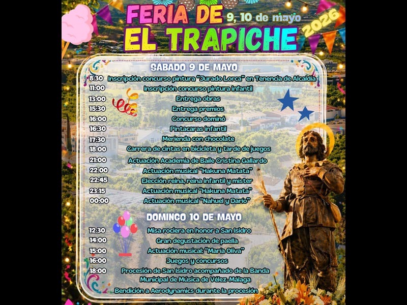 El Trapiche celebrará los días 9 y 10 de mayo su feria en honor a San Isidro, con un programa que combina actividades lúdicas, tradicionales y musicales dirigidas a todos los públicos. Durante estas jornadas, vecinos de la localidad y visitantes compartirán una de las citas más destacadas del calendario festivo de El Trapiche, en un ambiente marcado por la convivencia, la gastronomía, los juegos y la música en directo.