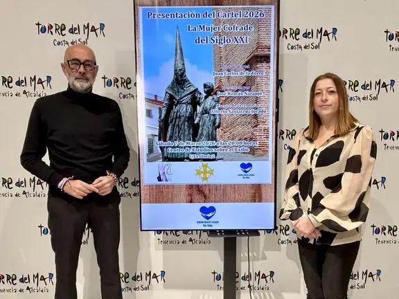 El concejal de Derechos Sociales e Igualdad del Ayuntamiento de Vélez-Málaga, Juan García, ha presentado junto a Estela López, tesorera de la mujer cofrade del siglo XXI, la quinta edición del cartel de la entidad, que este año se mostrará por primera vez en Vélez-Málaga. Estela López fue reconocida el pasado 8 de marzo de 2025 en el programa “Trayectorias Compartidas” por su labor pionera en visibilizar el papel de la mujer dentro de las cofradías.