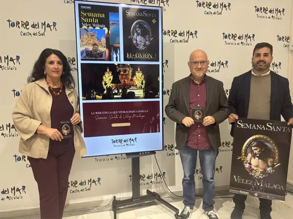 El primer teniente de alcalde de Vélez-Málaga y teniente de alcalde de Torre del Mar, Jesús Pérez Atencia; la concejala de Cultura del Ayuntamiento de Vélez-Málaga, Alicia Ramírez; y el concejal de Nuevas Tecnologías, David Segura, han presentado las diferentes acciones y novedades impulsadas por el Ayuntamiento en materia de promoción turística de la Semana Santa de Vélez-Málaga.