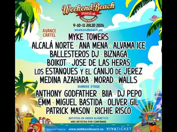 El Escenario Sunrise también crece con nombres potentes para 2026. Debuta Anthony Godfather, el productor madrileño que ha creado prácticamente un género propio: el latin tech. Una fusión pionera de ritmos latinos y electrónica que promete reventar la playa.Desde Granada llega Miguel Bastida, todo un referente tanto en cabina —fue residente de la mítica Industrial Copera— como en estudio, liderando proyectos como Raíz Electrónica o su sello Be One Records. Un lujo tenerlo de vuelta.Richie Risco, el asturiano Ricardo Rivero, se estrena en el festival tras consolidarse como uno de los DJs y productores nacionales más internacionales. Cierran el bloque electrónico los locales Oliver Gil y Emm, que pondrán el broche de oro desde casa.Estos catorce nuevos nombres se unen a un cartel que ya contaba con Myke Towers, Ana Mena, Medina Azahara, Patrick Mason, BIIA y DJ Pepo, entre otros.