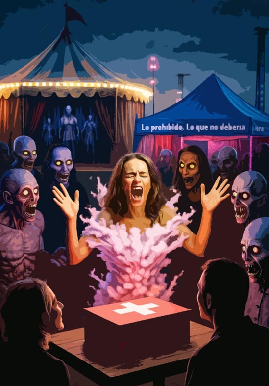 Las atracciones eran como visiones deformadas de una realidad grotesca: el hombre pez que tragaba cuchillos, la mujer barbuda que bailaba sobre vidrios, el mago exótico que prometía desaparecer a cualquiera que se atreviera. Las risas del público sonaban enlatadas, algo que no era alegría sino miedo ansioso compartido.