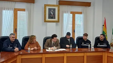 El alcalde de Vélez-Málaga, Jesús Lupiáñez, junto a los portavoces de los grupos municipales, ha recibido a los agentes Salvador Rodríguez y David Sánchez que actuaron en un incendio en el Centro de Vélez esta pasada semana, y a Jerónimo López y Antonio David Fortes, por su intervención e incautación de estupefacientes en la carretera de Arenas