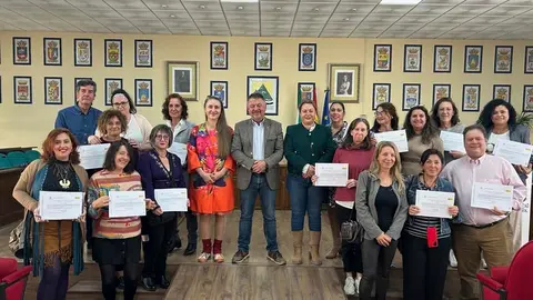 El presidente de la institución comarcal, Jorge Martín; la vicepresidenta, Marilé Muñiz, y la vocal de Formación, Rosa Luz Fernández, han hecho entrega de los diplomas de los programas formativos ‘Atención al cliente consumidor y usuario’, ‘Venta de Producto y Servicios Turísticos y ‘Comunicación en lengua extranjera (N2 y N3)